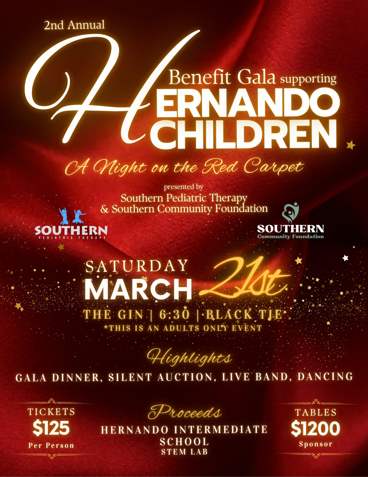 The date is set for the second annual Benefit Gala for Hernando Children, a special event dedicated to making a meaningful difference in the Hernando community. This year, funds raised will support Hernando Intermediate School in purchasing all the equipment needed for their very own STEM Lab. A STEM lab is a hands-on learning space where students explore Science, Technology, Engineering, and Math through active projects, experiments, and challenges. This project goes far beyond a single classroom. It will be a school-wide resource that teachers can reserve and use with their students, giving all children access to immersive learning experiences. Your participation will directly contribute to a project that fosters growth and learning for every child.